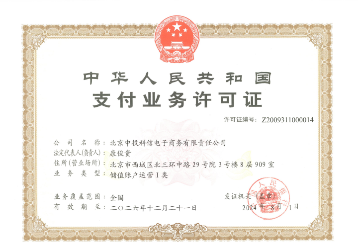 支付业务许可证是中国人民银行为了促进支付服务市场健康发展,规范非银行支付机构支付服务行为所颁发和管理的。 中投科信于2011年12月获批此证。